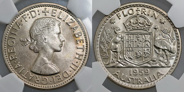 | Description: Florin. 1959. NGC graded MS 63 (2614553-208), Obverse 6, Reverse B type. Ex Benchmark collection. Light tone with mint bloom. Ch.UNC/GEM |