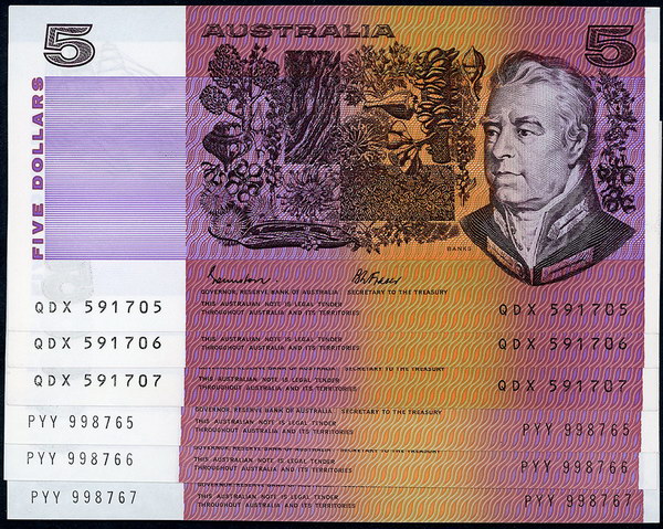 | Description: Five Dollar. 1985 Johnston-Fraser (R 209a). OCRB. Centre fold and handling. Consecutive trio, run of 4 and run of 7. (14 notes total). EF-aUNC |