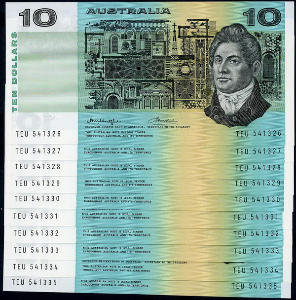 | Description: Ten Dollar. 1976 Knight-Wheeler (R 306a). Centre thread. Flick. Consecutive run of 10. High catalogue value. UNC |