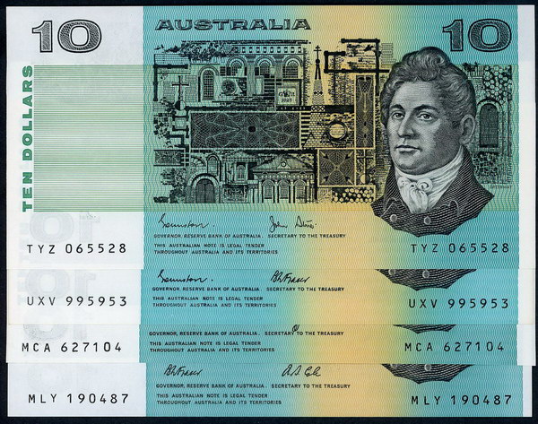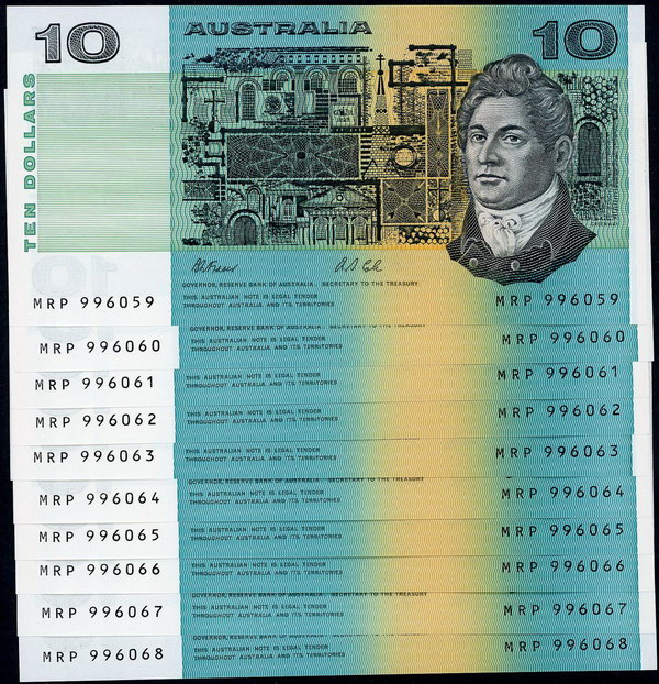 | Description: Ten Dollar. 1993 Fraser-Cole (R 313b). Without plate letter. Very slight flick. Consecutive run of 10. Catalogues at $750. UNC |