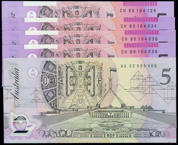 | Description: Five Dollar. 1995 polymer Fraser-Evans (R 217a). Wide bands. Slightly wavy, small depression in paper. Also 1992 Fraser-Cole (R 214) (handling). (5 notes total). aUNC |