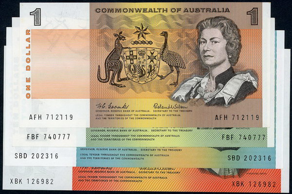 Description: Sets. 1967 Coombs-Randall set of 5 notes, 1 Dollar to 20 Dollars (R 72), (R 82), (R 202), (R 302), (R 402). The key decimal signatures and high catalogue value. Mostly well-circulated; the 1 Dollar with a taped tear and pinholes, 2 Dollar with a small edge split, 5 Dollar crisp with folds, 5, 10 and 20 Dollar with folds. (5 notes total).   aF-gVF