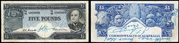 Description: Five Pound. 1954 Coombs-Wilson (R 49m). Million serial numbers. Serials TA/95 1000000. Folds and a little dirty/soiled, a few minor rust spots with writing in blue ink; JLS on front and on back -JLS, Thoughts, signed Harris and Shelly- JLS - Please Return- but a whole note with good colour. Very rare issue, with specially stamped last digit and only three examples known.   aFINE