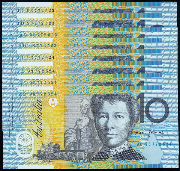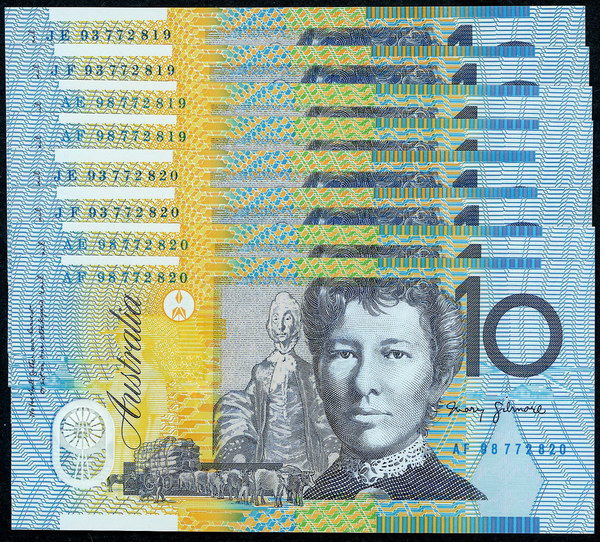 Description: Ten Dollar. 1994 polymer Fraser-Evans First prefix $5 and $10 AA 94; consecutive run of 5 undated matching serial pairs: AA94 008577-81 (ex NPA sets). (10 notes total, no folders).   UNC