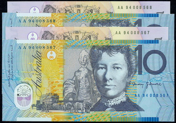 Description: Ten Dollar. 1994 polymer Fraser-Evans First prefix $5 and $10 AA 94; two undated matching serial pairs: AA94 008567/68 (ex NPA set). (4 notes total, no folders).   UNC