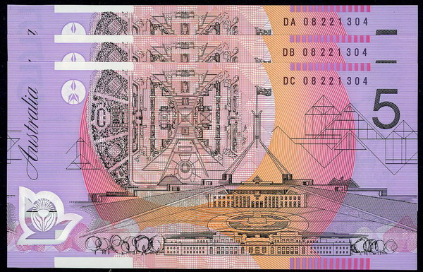 Description: Five Dollar. 2008 polymer Stevens-Henry (R 221b). Trio of consecutive prefix notes with matching serials; DA/DB/DC 221304. Slightly curled. (3 notes total).   UNC