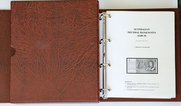 Description: Australian Decimal Banknotes album with Michael Vort-Ronald interleaves and dust cover and additional pages.   USED