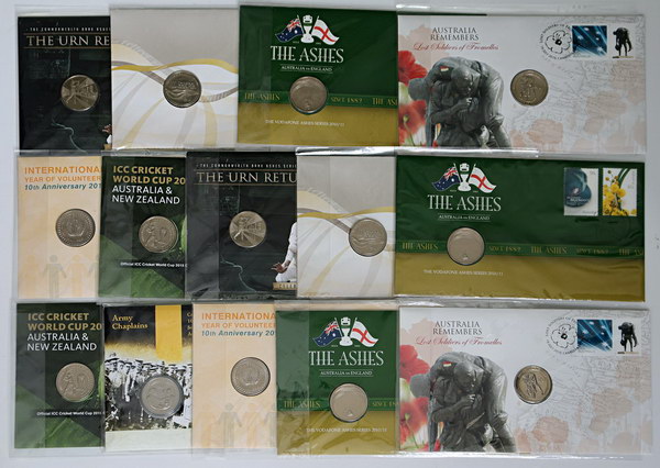Description: Twenty Cent. 2010-2015 assorted First Day Covers: 2010 ATO (2), The Ashes (3), Fromelles (2), 2011 Volunteers 2), 2013 Army Chaplains, 2014 The Urn Returns (2) and 2015 ICC World Cup (2). High catalogue value. (14 items total).   UNC