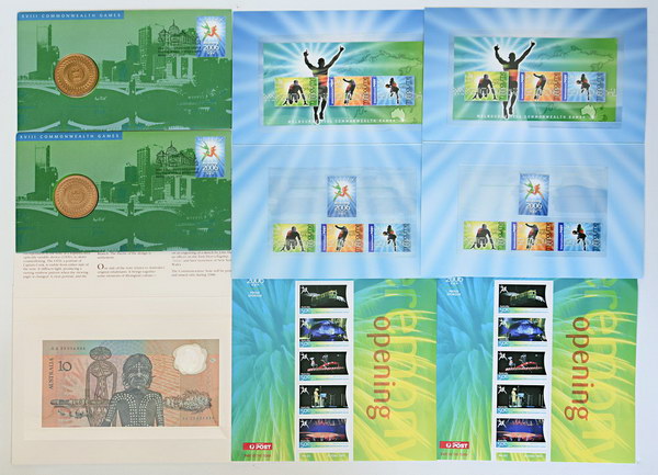 | Description: Ten Dollar. 1988 Bicentenary polymer Johnston-Fraser AA 23 in folder and envelope. Also PNC 2006 Commonwealth Games with Unc $5 (2) and stamp sheets (4; some with folds). (7 items total). UNC |