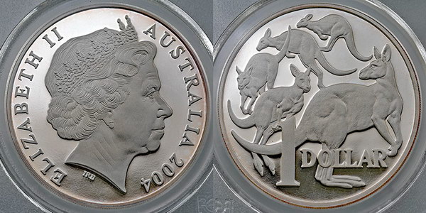 | Description: One Dollar. 2004 Mob of Roos 1 oz silver Proof. PCGS graded PR 70 DCAM (80077835). The highest possible grade at PCGS. FDC |
