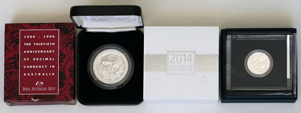 | Description: One Dollar. 1996 Decimal Currency 30 Years 1 oz silver Proof and 2014 MOR silver Proof Dollar. In boxes of issue with COA (environmental damage to first). (2 items total). FDC |