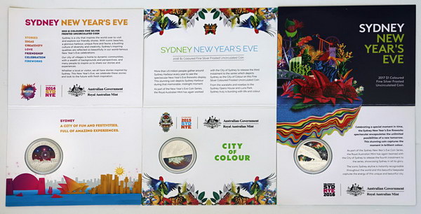 | Description: One Dollar. 2015, 2016, 2017 Sydney NYE Fireworks coloured 1/2 oz silver Unc issues. In packs of issue. (3 items total). UNC |
