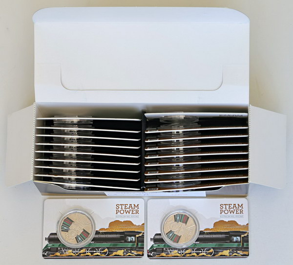 | Description: Fifty Cent. 2022 Steam Power: SA 500 Class coloured Unc 20 Cents on RAM cards. Retail for $20+ each. Full display box of 20. UNC |