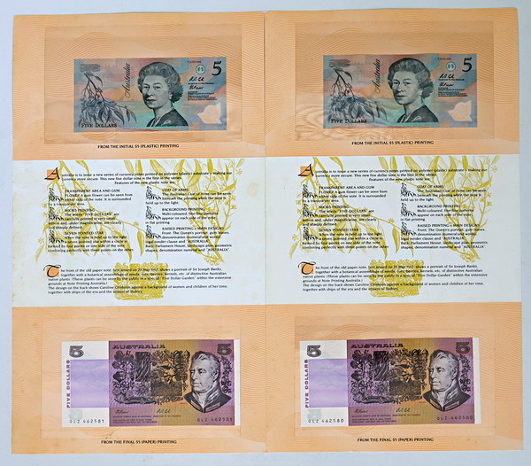 | Description: Five Dollar. 1992 Fraser-Cole Last and First paper/polymer 2-note folders. Consecutive pair. Catalogues at $400. UNC |