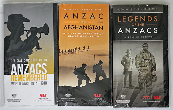 | Description: Twenty Cent. 2016 Anzac to Afghanistan, 2017 Anzac Legends, 2018 Anzac Spirit; 20 Cent 14-coin collections in folders. Retail for approx $100 each. (3 items total). UNC |
