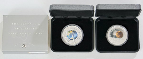 | Description: One Dollar. 2000/01 Millennium coloured 1oz silver Proofs; 2000 Sun, Earth, Moon and 2001 Cleopatras Needle. In packs of issue with COA, the first missing outer slipcase. (2 items total). FDC |