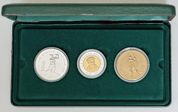| Description: Sets. 2001 Sir Don Bradman tri-metal 3-coin set; bimetal silver/gold Proof 20 Dollar, silver Proof 5 Dollar and cu/ni Unc 5 Dollar. In single case of issue with COA and dust cover (marks/cracking to case). UNC-FDC |