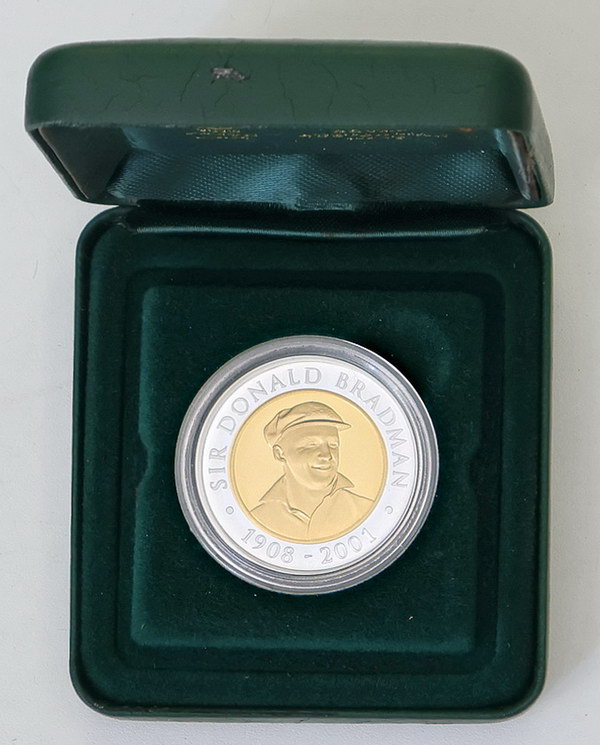 | Description: Twenty Dollar. 2001 Sir Don Bradman bimetal silver/gold Proof 20 Dollar. In case of issue with COA and dust cover (marks/cracking to case). FDC |