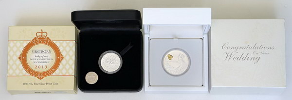 | Description: One Dollar. 2015 Wedding Congratulations selectively gold-plated 1 oz silver Proof. Also RAM 2013 Royal Collection: First Born 50 Cent silver Proof (damage to inner case). In boxes of issue with COA. (2 items total). FDC |