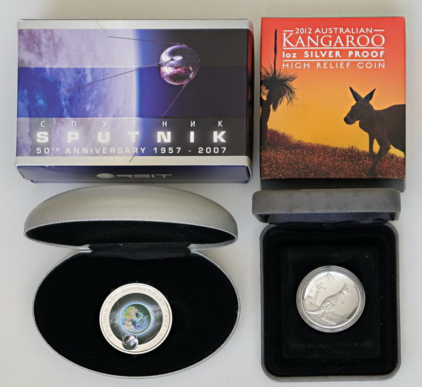 | Description: One Dollar. 2007 Sputnik 50th Ann spinning coloured 1 oz silver Cook Islands Dollar and 2012 Australian Kangaroo High Relief 1 oz silver Proof. In boxes of issue with COA (environmental damage to latter). (2 items total). FDC |