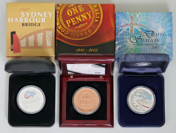 | Description: One Dollar. 2007 Australian Antarctic Territory Davis Station and 2007 Sydney Harbour Bridge 1oz coloured silver Proof issues (environmental damage to cases). Also 2005 Tuvalu 1930 Penny copper-plated 1oz silver Proof (by Downies). In boxes of issue with COA. (3 items total). FDC |