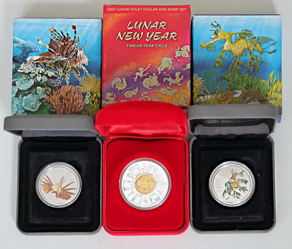 | Description: 2007 Lunar New Year: 12-Year Cycle selectively gold-plated Holey Dollar and Dump silver Proof issue and 2009 Australian Sea Life Reef: Sea Dragon and Lion Fish 1/2 oz coloured silver Proof 50 Cents issues (some environmental damage to cases). In boxes of issue with COA. (3 items total). FDC |