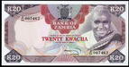 Description: Zambia 20 Kwacha 1974 (P 18a), signature 4. Light handling, but scarce.   aU/UNC