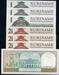 Description: Suriname Dutch administration 1 Gulden 1974 (P 116d) pair and single, 2.5 Gulden 1961 (P 117a) ZZ prefix (3) and 25 Gulden 1982 (P 127a). (7 notes total).   UNC