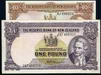 Description: New Zealand 10 Shillings and 1 Pound Fleming (P 158d) and (P 159d). Folds, handling, the latter more worn with four pinholes. (2 notes total).   aF-gVF