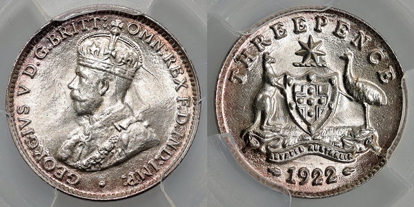 | Description: Threepence. 1922. PCGS graded MS 64 (56919576). Light peripheral tone with bright bloom. Ch.UNC/GEM |