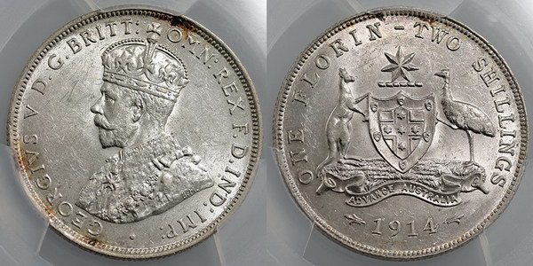 | Description: Florin. 1914. PCGS graded MS 62 (52717404). Some tone, heavier on Reverse, with bright bloom and some marks. UNC/Ch.UNC |