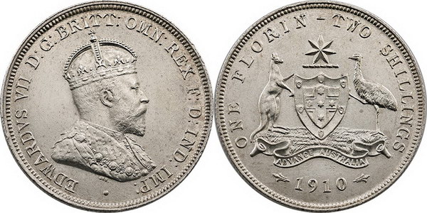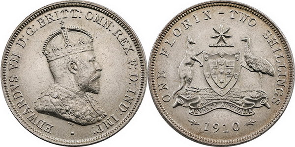 | Description: Florin. 1910. Light old tone with frosty mint bloom, well struck with sharp feathers, some hairlines/scratching in fields behind Kangaroo and a few Obverse marks. Ch.UNC |