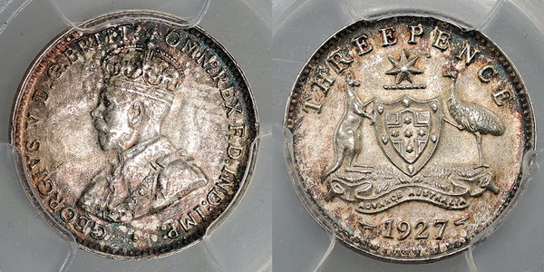 | Description: Threepence. 1927. PCGS graded MS 64 (38282739). Some old tone with bloom. Ch.UNC/GEM |