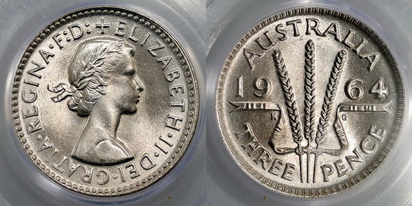 | Description: Threepence. 1964. PCGS graded MS 67 (20908530). Satin mint bloom. GEM UNC |