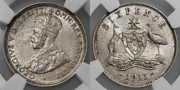 | Description: Sixpence. 1911. NGC graded AU 58 (8222022-013). Toned with underlying bloom. aUNC/UNC |