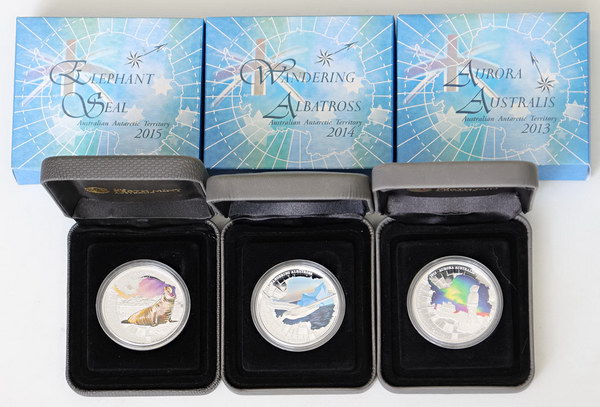 Description: One Dollar. 2013-15 Australian Antarctic Territory coloured 1 oz silver Proofs: Aurora Australis, Wandering Albatross and Elephant Seal. In boxes of issue with COAs. (3 items total).   FDC