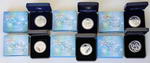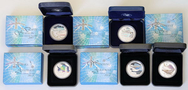 Description: One Dollar. 2004-12 Australian Antarctic Territory coloured 1 oz silver Proofs: 2004 Mawson Station, 2007 Davis Station (minor marks to box), 2009 South Magnetic Pole, 2010 Husky, 2011 Killer Whale, 2012 Emperor Penguin. In boxes of issue with COAs. (6 items total).   FDC