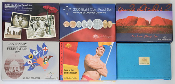 Description: Proof Sets. 2001, 2002, 2003 (no box), 2005, 2006, 2007 Proof sets. Minor marks. (6 items total).   FDC