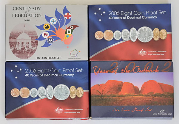 Description: Proof Sets. 2001, 2002, 2006 (2) Proof sets. Minor marks. (4 items total).   FDC