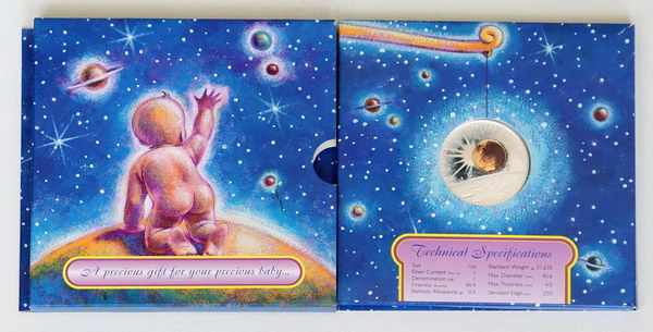 Description: One Dollar. 2000 Millennium Moon, Earth and Sun 1 oz coloured silver Proof. In Precious Baby pack with COA and slip cover.   PROOF-LIKE