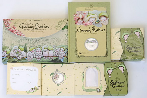 Description: 2016 Snugglepot and Cuddlepie 100th Anniversary 1 oz coloured silver Proof coin embedded in a limited edition book. Also Snugglepot and Cuddlepie 1/2 oz coloured silver Proof 50 Cents in individual packs (2). (3 items total).    FDC