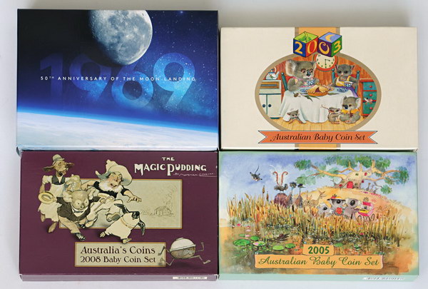 Description: Proof Sets. 2003, 2005, 2008 Baby Proof sets and 2019 Moon Landing Proof set. (4 items total).   FDC