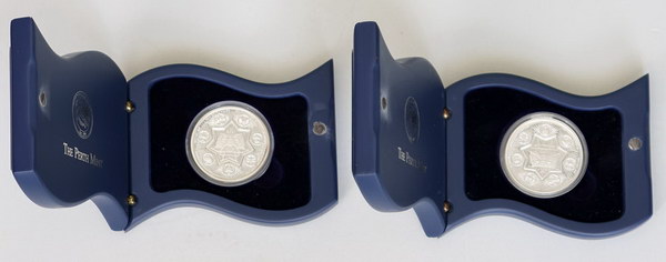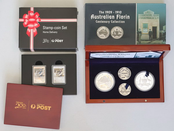 Description: Ten Dollar. 2009 Australia Post 200 Years: Home Delivery 1/2 oz coloured silver Proof stamp-coin and stamp set (box taped) and Cook Islands off-mint Australian Florin Centenary 1 oz silver Proof 2-coin plus 2-replica set. In box with COA (struck by Perth Mint for Downies). (2 items total).   FDC