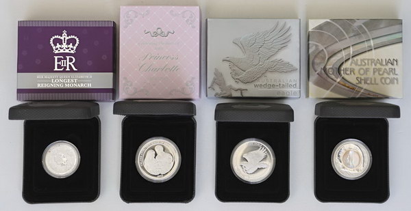 Description: One Dollar. 2015 Mother of Pearl Shell, Wedge-Tailed Eagle, Princess Charlotte and Longest Reigning Monarch 1 oz silver Proofs. In boxes of issue with COA. (4 items total).   FDC