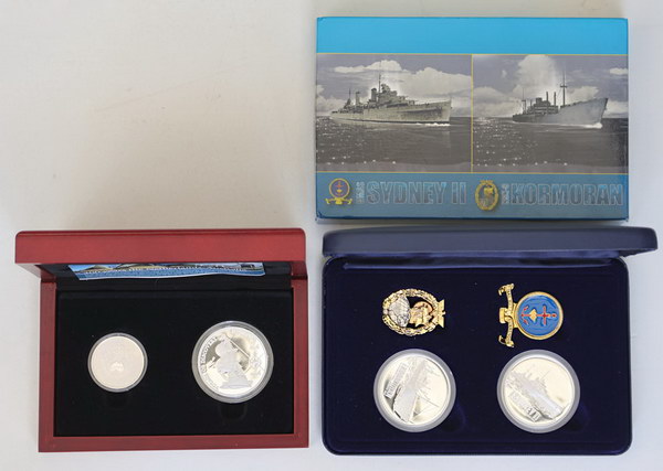 Description: One Dollar. 2008 HMAS Sydney/HSK-8 Kormoran 1 oz silver Proof coin and medallion with replica miniature badges set and RAM 2006 Australia/Netherlands Duyfken 2-coin set of silver Proof 5 Euro and 5 Dollar. In box/case of issue with COA Marks to latter slipcase). (2 items total).   FDC