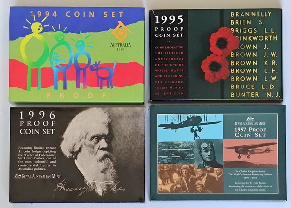 Description: Proof Sets. 1994, 1995, 1996, 1997 Proof sets. Minor marks. (4 items total).   FDC