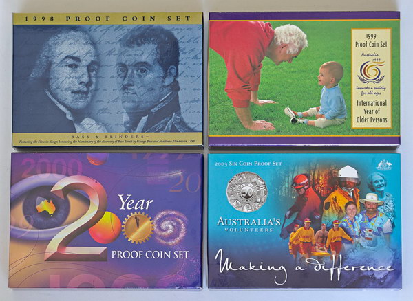Description: Proof Sets. 1998, 1999, 2000, 2003 Proof sets. Minor marks. (4 items total).   FDC