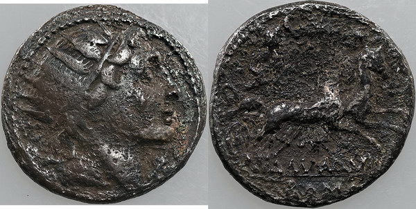 Description: Ancient Rome Republic silver Denarius N/D (109-108 BC), moneyer Manlius Aquillius Rome mint (19mm). Obv: radiate bust of Sol right, x below chin, Rev: Roma in emerge, Luna in Bega right with crescent moon above, three stars above and star below. Dark toned, porous.   aFINE