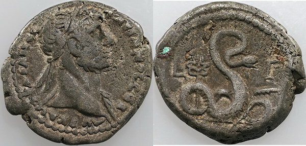 Description: Ancient Rome Provincial, Egypt Hadrian Emperor billon Tetradrachm N/D (117-118 AD), Alexandra mint (23mm). Obv: laureate bust Hadrian right, Rev: Agathodaemon serpent crowned with pschent enfolding caduceus and ear of corn. Toned.   aFINE