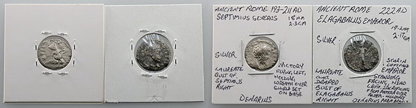 Description: Ancient Rome Imperial Septimius Severus silver Denarius N/D (193-211 AD) (18mm). Obv: laureate bust right, Rev: Victory flying left, wreath over shield set on base. Also Elagabalus silver Denarius 222 AD. Obv: laureate and draped bust right, Rev: Emperor standing facing head left, sacrificing from patera over altar holding palm branch. Latter toned. (2 coins total).   VG/aFINE